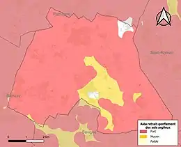 Les mouvements de terrains susceptibles de se produire sur la commune sont des affaissements et effondrements liés aux cavités souterraines (hors mines) et des tassements différentiels[19]. Afin de mieux appréhender le risque d’affaissement de terrain, un inventaire national permet de localiser les éventuelles cavités souterraines sur la commune[20]. Le retrait-gonflement des sols argileux est susceptible d'engendrer des dommages importants aux bâtiments en cas d’alternance de périodes de sécheresse et de pluie[21]. 98,3 % de la superficie communale est en aléa moyen ou fort (79,5 % au niveau départemental et 48,5 % au niveau national)[Carte 2]. Depuis le , en application de la loi ÉLAN, différentes contraintes s'imposent aux vendeurs, maîtres d'ouvrages ou constructeurs de biens situés dans une zone classée en aléa moyen ou fort[Note 2],[22].