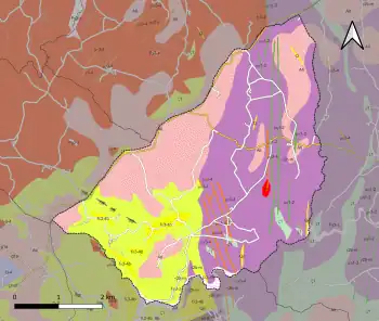 Les couches affleurantes sur le territoire communal sont constituées de formations superficielles du Quaternaire datant du Cénozoïque et de roches sédimentaires du Mésozoïque et du Paléozoïque, ainsi que de roches métamorphiques et magmatiques. La formation la plus ancienne, notée ξ1, se compose de micaschistes lamelleux à deux micas, parfois grenats et silicates d'alumine (groupe de la Dronne, Néoprotérozoïque à Cambrien). La formation la plus récente, notée Fy3-z, fait partie des formations superficielles de type alluvions subactuelles à actuelles. Le descriptif de ces couches est détaillé dans les feuilles « no 711 - Châlus » et « no 735 - Thiviers » de la carte géologique au 1/50 000 de la France métropolitaine[2],[3] et leurs notices associées[4],[5].