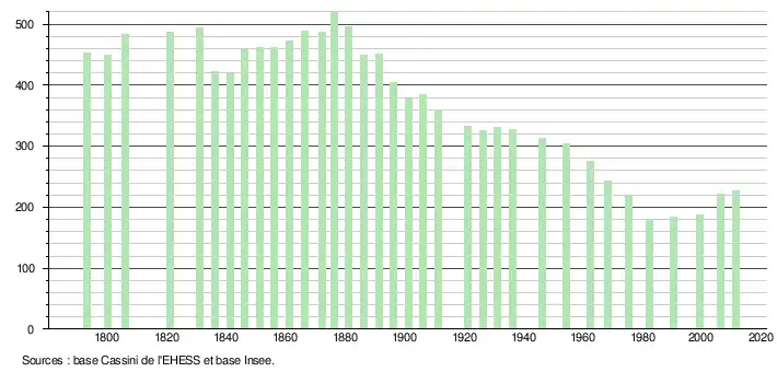L'évolution du nombre d'habitants est connue à travers les recensements de la population effectués dans la commune depuis 1793. À partir du , les populations légales des communes sont publiées annuellement dans le cadre d'un recensement qui repose désormais sur une collecte d'information annuelle, concernant successivement tous les territoires communaux au cours d'une période de cinq ans. Pour les communes de moins de 10 000 habitants, une enquête de recensement portant sur toute la population est réalisée tous les cinq ans, les populations légales des années intermédiaires étant quant à elles estimées par interpolation ou extrapolation[11]. Pour la commune, le premier recensement exhaustif entrant dans le cadre du nouveau dispositif a été réalisé en 2006[12],[Note 1].