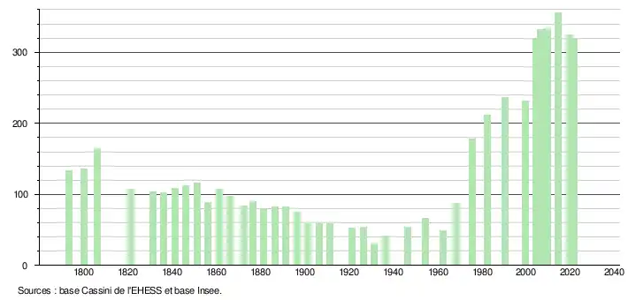 L'évolution du nombre d'habitants est connue à travers les recensements de la population effectués dans la commune depuis 1793. Pour les communes de moins de 10 000 habitants, une enquête de recensement portant sur toute la population est réalisée tous les cinq ans, les populations légales des années intermédiaires étant quant à elles estimées par interpolation ou extrapolation[21]. Pour la commune, le premier recensement exhaustif entrant dans le cadre du nouveau dispositif a été réalisé en 2004[22].