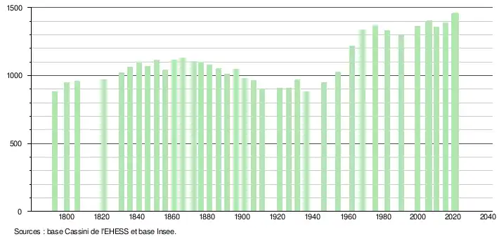 L'évolution du nombre d'habitants est connue à travers les recensements de la population effectués dans la commune depuis 1793. Pour les communes de moins de 10 000 habitants, une enquête de recensement portant sur toute la population est réalisée tous les cinq ans, les populations légales des années intermédiaires étant quant à elles estimées par interpolation ou extrapolation[14]. Pour la commune, le premier recensement exhaustif entrant dans le cadre du nouveau dispositif a été réalisé en 2005[15].