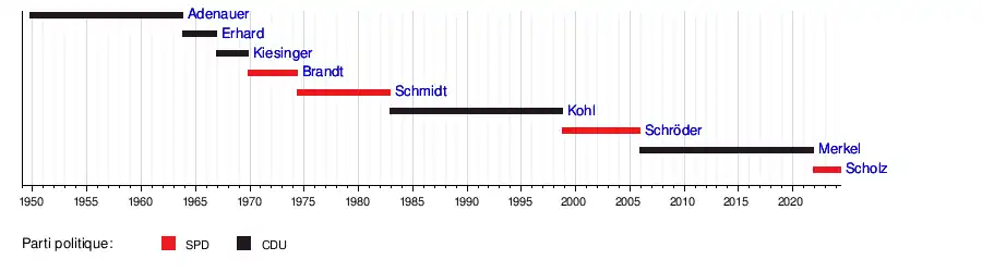 | 8 | Kurt Georg Kiesinger | 1 055 jours | 2 ans, 10 mois et 20 jours | 3 | 1966 – 1969 | Battu aux élections fédérales. |