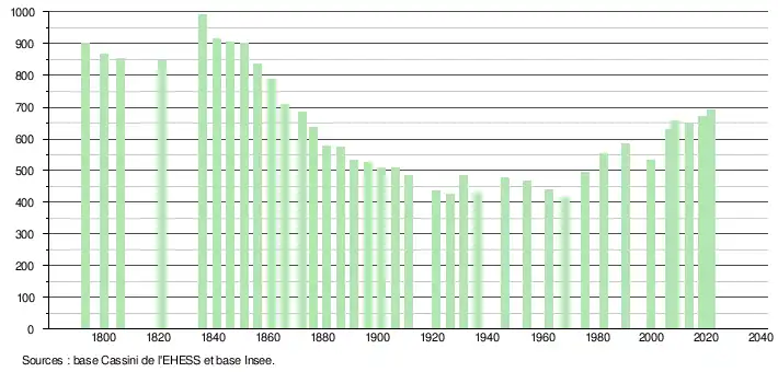 L'évolution du nombre d'habitants est connue à travers les recensements de la population effectués dans la commune depuis 1793. Pour les communes de moins de 10 000 habitants, une enquête de recensement portant sur toute la population est réalisée tous les cinq ans, les populations légales des années intermédiaires étant quant à elles estimées par interpolation ou extrapolation[20]. Pour la commune, le premier recensement exhaustif entrant dans le cadre du nouveau dispositif a été réalisé en 2008[21].