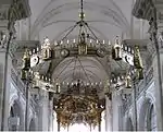 Le chandelier de Barberousse est en cuivre doré ; il a un diamètre de 4,16 mètres. Il est fixé au centre de la coupole octogonale au moyen d'une chaîne d'environ 27 mètres qui se termine dans une boule centrale. Les maillons de la chaîne diminuent du haut vers le bas d'une longueur de 150 mm vers 130 mm et d'une largeur de 74 mm vers 70 mm[1]. Cela donne l'impression, vu d'en bas, que la chaîne a la même épaisseur sur toute sa longueur.