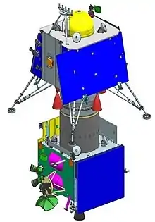 Chandrayaan-2 est un engin de 3 850 kg comprenant un orbiteur d'une masse d'environ 2 379 kg et l'atterrisseur Vikram de 1 471 kg qui, après s'être posé sur le sol lunaire, y dépose l'astromobile (rover) Pragyan d'une masse de 27 kg. Une quinzaine d'instruments scientifiques (caméras, spectromètres, sismomètres, etc.) sont répartis entre les trois engins spatiaux. Chandrayaan-2 est le premier engin spatial indien à se poser sur un autre corps céleste. L'Inde est la cinquième nation qui tente d'effectuer un atterrissage en douceur sur le satellite naturel de la Terre après l'Union soviétique, les États-Unis, la Chine et Israël (échec).