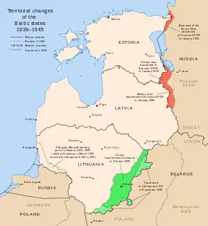 Les changements territoriaux des États baltes font référence au redessin des frontières de la Lituanie, de la Lettonie et de l'Estonie après 1940. Les trois républiques, autrefois régions autonomes au sein de l'ancien Empire russe et avant celle de l'ancienne république des Deux Nations et en tant que provinces de l'Empire suédois, a obtenu son indépendance au lendemain de la Première Guerre mondiale et de la révolution russe de 1917. Après une guerre d'indépendance sur deux fronts menée contre les forces nationalistes russes bolcheviques et allemandes baltes, les pays ont conclu des traités de paix et frontaliers avec la Russie soviétique en 1920. Cependant, avec la Seconde Guerre mondiale et l'occupation et l'annexion de ces républiques à l'Union soviétique vingt ans après leur indépendance, certaines modifications territoriales ont été apportées en faveur de la RSFS de Russie. Cela a été la source de tensions politiques après qu'ils ont retrouvé leur indépendance avec la dislocation de l'Union soviétique. Certains des différends restent non résolus.