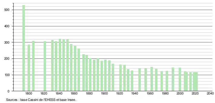 L'évolution du nombre d'habitants est connue à travers les recensements de la population effectués dans la commune depuis 1793. Pour les communes de moins de 10 000 habitants, une enquête de recensement portant sur toute la population est réalisée tous les cinq ans, les populations légales des années intermédiaires étant quant à elles estimées par interpolation ou extrapolation[16]. Pour la commune, le premier recensement exhaustif entrant dans le cadre du nouveau dispositif a été réalisé en 2008[17].