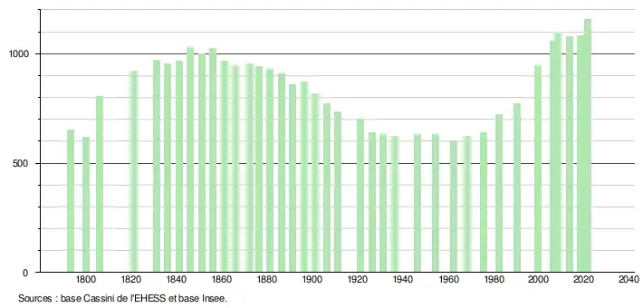 L'évolution du nombre d'habitants est connue à travers les recensements de la population effectués dans la commune depuis 1793. Pour les communes de moins de 10 000 habitants, une enquête de recensement portant sur toute la population est réalisée tous les cinq ans, les populations légales des années intermédiaires étant quant à elles estimées par interpolation ou extrapolation[20]. Pour la commune, le premier recensement exhaustif entrant dans le cadre du nouveau dispositif a été réalisé en 2008[21].
