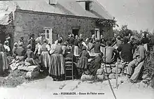 Devant travailler sans cesse pour survivre, le moindre moment est occupé à de menus travaux[a 12]. Dans une microsociété paysanne, imprégnée de tradition et de religiosité catholique, quasi inchangée du XVe au XXe siècle, la méfiance de l'étranger se retrouve dans des chansons satiriques et couplets improvisés se moquant volontiers des habitants d'autres paroisses[a 13]. Jusqu'au milieu du XIXe siècle, il n'y a pas ou peu de routes. Les déplacements se faisant principalement à pied, le marcheur, seul ou à plusieurs, récite son répertoire de chansons pour se motiver, se rassurer ou faire passer le temps. Quittant le Centre-Bretagne pour vendre leurs maigres récoltes, les pilhaouerien (chiffonniers) sèment dans leur pays une production de littérature orale glanée au cours de leurs pérégrinations. Malgré les différences de richesse, comme entre les propriétaires sur la côte bigoudène et les métayers montagnards, ils montrent une unité culturelle, obéissant aux mêmes rituels, dansant sur les mêmes airs, pleurant aux mêmes gwerzioù[a 14]... La culture paysanne en général, et bretonne plus longtemps qu'ailleurs, est marquée par cet aspect collectif de la vie quotidienne, pour les durs labeurs comme pour les moments de réjouissance. Par exemple, lorsque quelqu'un entame une chanson, le groupe la reprend aussitôt[a 15]. Chanteurs ambulants et sonneurs professionnels se déplacent sur des distances hors normes, ouvrant des horizons inhabituels, propres à susciter la curiosité des auditeurs.