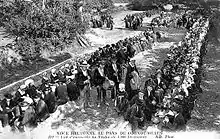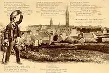 La Révolution française inspire de nombreux chants, que le chanoine Perennès réuni dans les Annales de Bretagne (tomes 41 et 42, 1934-1935). Après la Révolution, l'apparente fin des abus du centralisme laisse place à un régime plus despotique, allant pour la Bretagne à l'encontre de sa position autonomiste[n 6] et sa vision fédéraliste[b 7]. Dans une Bretagne« religieuse et antimilitariste »[16], la Chouannerie est au départ une réaction populaire, relayée dans la Terreur par les royalistes (Blancs) face aux républicains (Bleus). L'excès jacobin à l'encontre des libertés bretonnes est illustré dans la chanson Les Bleus en cette fin du XVIIIe siècle et une des victoires des chouans est narrée dans Ar Chouanted avec les héros Julien et Georges Cadoudal. À partir du Premier Empire, le régime autoritaire et centralisateur tend à fondre les caractères spécifiques des « provinces » dans un moule commun, grâce à un système juridique, administratif et militaire[b 8]. L'armée est mal vécue par les Bretons sur le plan sentimental (séparation avec sa terre et ses proches) et donne naissance à des chansons, comme la satirique Tenval an Deiz arrangée par Alan Stivell. Après la Restauration, la situation n'est guère restaurée et certains comme Jak an Dall (Jacques l'aveugle) écrivent des couplets haineux et vengeurs à Louis-Philippe « l'usurpateur ». Sous un style démagogique, les dirigeants souhaitent franciser la Bretagne et la langue bretonne trouve refuge dans les institutions catholiques[b 9].