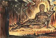 Et cet homme couché, se rendant compte qu'on parle de lui, s'écrie : (paraphrase) « Tel que j'étais de mon vivant (un blasphémateur), tel je suis quand je suis mort. Même si Jupiter a fatigué son forgeron à qui, dans sa colère, il a pris la foudre tranchante avec laquelle j'ai été frappé le dernier jour de ma vie ; même s'il a fatigué les autres Cyclopes dans la noire forge de l'Etna (on utilise ici l'ancien nom, Mongibello), en appelant « Bon Vulcain, au secours, au secours ! », comme il l'a fait dans la bataille contre les Géants, et m'a terrassé de toutes ses forces : il n'a pas pu avoir une vengeance joyeuse. (versets 51-61).