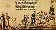Dante se dirige ensuite vers la troisième catégorie de damnés dans le cercle des violents contre Dieu et contre nature. Il a déjà rencontré un blasphémateur (Capanée), plusieurs sodomites (Brunetto Latini et les trois Florentins), mais toujours pas d'usuriers, c'est-à-dire aucun de ces violents contre la nature et l'art, qui, comme l'explique le Chant XI, ne tirent leur gain ni de la sueur ni de l'esprit, mais de l'argent lui-même[1]. Ils sont à mi-chemin entre le châtiment des violents contre Dieu (couchés sur le sol, sous la pluie de feu), le pire, et celui des sodomites (courant avec agitation sous la pluie de flammes), le plus doux. En effet, ils doivent s'asseoir et, avec leurs mains, s'éventer et tenter sans cesse d'éteindre les flammes qui viennent de tomber. Dans cette activité, Dante les compare aux chiens qui se grattent avec leurs pattes pour éloigner les morsures « soit de puces, soit de mouches, soit de taons », un sentiment répugnant souligné par la comparaison avec les animaux. De plus, Dante note qu'ils portent chacun un sac autour du cou avec des motifs, ce qui fait probablement allusion aux sacs que les prêteurs et les changeurs de monnaie portaient autour du cou lors de leurs transactions commerciales et qui les distinguaient avec leurs livres de comptes. Sur ces sacs sont imprimés les blasons familiaux, que Dante utilise pour désigner les familles d'usuriers, plutôt que les pécheurs individuels. Il n'indique pas leurs noms, mais les armoiries de l'époque devaient une référence claire.