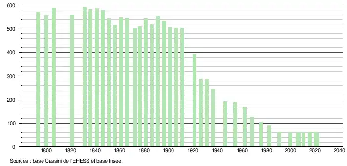 L'évolution du nombre d'habitants est connue à travers les recensements de la population effectués dans la commune depuis 1793. Pour les communes de moins de 10 000 habitants, une enquête de recensement portant sur toute la population est réalisée tous les cinq ans, les populations légales des années intermédiaires étant quant à elles estimées par interpolation ou extrapolation[22]. Pour la commune, le premier recensement exhaustif entrant dans le cadre du nouveau dispositif a été réalisé en 2005[23].
