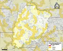 Le retrait-gonflement des sols argileux est susceptible d'engendrer des dommages importants aux bâtiments en cas d’alternance de périodes de sécheresse et de pluie. 36,9 % de la superficie communale est en aléa moyen ou fort (26,8 % au niveau départemental et 48,5 % au niveau national). Sur les 350 bâtiments dénombrés sur la commune en 2019, 36 sont en aléa moyen ou fort, soit 10 %, à comparer aux 36 % au niveau départemental et 54 % au niveau national. Une cartographie de l'exposition du territoire national au retrait gonflement des sols argileux est disponible sur le site du BRGM[18],[Carte 2].