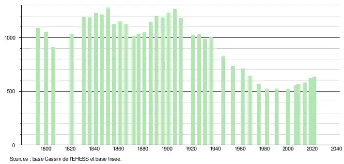 | L'évolution du nombre d'habitants est connue à travers les recensements de la population effectués dans la commune depuis 1793. Pour les communes de moins de 10 000 habitants, une enquête de recensement portant sur toute la population est réalisée tous les cinq ans, les populations légales des années intermédiaires étant quant à elles estimées par interpolation ou extrapolation[23]. Pour la commune, le premier recensement exhaustif entrant dans le cadre du nouveau dispositif a été réalisé en 2008[24]. En 2021, la commune comptait 635 habitants[Note 3], en augmentation de 7,26 % par rapport à 2015 (Corrèze : −0,86 %, France hors Mayotte : +1,84 %). |