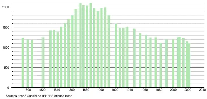 L'évolution du nombre d'habitants est connue à travers les recensements de la population effectués dans la commune depuis 1793. Pour les communes de moins de 10 000 habitants, une enquête de recensement portant sur toute la population est réalisée tous les cinq ans, les populations légales des années intermédiaires étant quant à elles estimées par interpolation ou extrapolation[20]. Pour la commune, le premier recensement exhaustif entrant dans le cadre du nouveau dispositif a été réalisé en 2008[21].