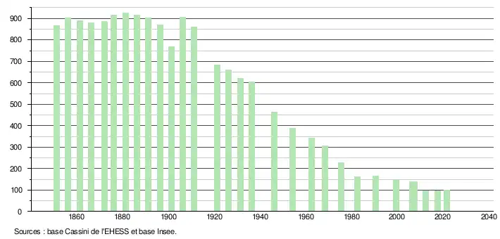 L'évolution du nombre d'habitants est connue à travers les recensements de la population effectués dans la commune depuis 1851. Pour les communes de moins de 10 000 habitants, une enquête de recensement portant sur toute la population est réalisée tous les cinq ans, les populations légales des années intermédiaires étant quant à elles estimées par interpolation ou extrapolation[16]. Pour la commune, le premier recensement exhaustif entrant dans le cadre du nouveau dispositif a été réalisé en 2007[17].