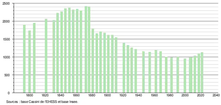 L'évolution du nombre d'habitants est connue à travers les recensements de la population effectués dans la commune depuis 1793. Pour les communes de moins de 10 000 habitants, une enquête de recensement portant sur toute la population est réalisée tous les cinq ans, les populations légales des années intermédiaires étant quant à elles estimées par interpolation ou extrapolation[25]. Pour la commune, le premier recensement exhaustif entrant dans le cadre du nouveau dispositif a été réalisé en 2007[26].