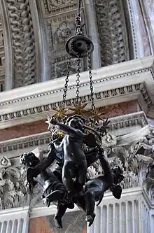 Il n'y a pratiquement pas de mobilier présent dans la chapelle actuellement, à l'exception d'une précieuse lampe votive en bronze, formée d'une couronne dorée ornée des huit étoiles des Chigi et soutenue par des angelots volants. Le modèle est une référence symbolique à la couronne de la Vierge, patronne de la chapelle et de la famille Chigi. La lampe a été conçue par Le Bernin lui-même. Dans son journal, le pape confirme la paternité du grand sculpteur. Le , en effet, il écrit : « Hier, nous avons vu la lampe en bronze fabriquée par Bernini pour la chapelle du Peuple »[2]. La lampe a été modelée par Peter Verpoorten, l'assistant flamand du Bernin, moulée par Francuccio Francucci et dorée par Francesco Perone. Philippe Baldinucci rapporte dans sa Vie que Le Bernin « avait l'habitude de mettre autant d'étude et d'application dans la conception d'une lampe à huile qu'il le faisait pour concevoir un bâtiment très noble »[3]. Une lampe similaire a été fabriquée pour la chapelle Cybo, et une autre copie a été faite en 1885 pour le Palazzo Chigi à Ariccia[4]. D'autres moulages de la lampe sont également connus.