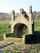 La fontaine de Kerdévot est située à environ 300 mètres à l'Est de la chapelle. Elle se présente sous la forme d'un édicule de style gothique comprenant une niche abritant la source et un toit à deux pans surmonté de deux pinacles et d'un blason[23]. La niche abrite également une statue de la Vierge portant l'Enfant-Jésus[25].