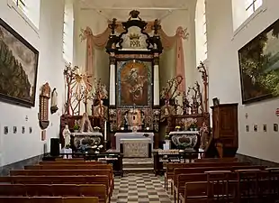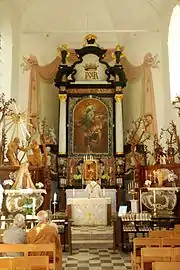 Le maître-autel est flanqué de deux petits autels latéraux, dont celui de gauche porte la statue de la Vierge.