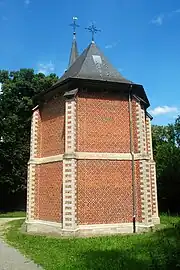 Érigée en briques et en grès, elle est couverte d'ardoises et surmontée d'un clocheton hexagonal à abat-sons et flèche d'ardoises.