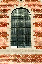 Le registre médian de la façade est constitué de six panneaux de briques encadrés de pierre de taille. La partie centrale de ce registre est percé d'une grande verrière cintrée flanquée de deux grands oculi et surmontée d'un petit fronton triangulaire qui appartient déjà au troisième registre.
