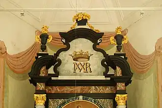 La façade se termine par un pignon à volutes très complexe, composé d'une dizaine de panneaux, d'un grand médaillon représentant une Vierge à l'Enfant[12] et d'un fronton triangulaire.