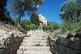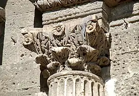 - Le second portail, qui englobe le premier, est flanqué de deux colonnes qui devaient être initialement cannelées (comme en témoigne la partie supérieure du fût de la colonne de gauche). Ces colonnes sont surmontées de chapiteaux à feuilles d'acanthe[4] supportant un fronton triangulaire[4] orné d'une frise d'oves et d'une frise de feuilles d'acanthe.