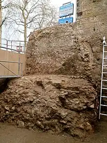 Le dégagement des vestiges du mur gallo-romain, dont les dimensions sont évaluées à m de haut sur m d'épaisseur et 14 m de long permet de préciser le profil du castrum dans cette partie de la ville, mais la poterne attendue - en lien avec l'échange indiqué dans le texte de 919 - n'a pas été retrouvée, le mur ayant été détruit à cet endroit au XIXe siècle[35].