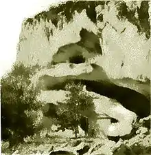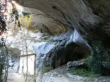 Au-dessus, il existe deux abris sous roche qui communiquent par un pertuis creusé à la main. Les fouilles archéologiques ont prouvé qu'ils ont été occupés à l'époque préhistorique[1]. Ces deux grottes sont accessibles par une échelle de bois et des cordes[7]. À proximité, d'autres fouilles ont mis au jour les reliefs des repas des premiers chasseurs qui fréquentaient les gorges 150 000 ans avant notre ère. Ils se nourrissaient de rhinocéros, mégacéros, auroch, cheval, cerf et élan[8]. Le site voisin du Bau de l'Aubesier fouillé sous la direction de Serge Lebel de l'Université du Québec à Montréal a mis en évidence, en 2006, la présence de l'homme de Néandertal et de pré-néandertaliens[5].