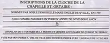 - Ces informations figurent sur les inscriptions de la cloche. Sa fabrication n'est pas mentionnée dans les registres de Villedieu-les-Poêles, ce qui laisse supposer qu'elle fut fondue en secret.