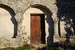 Ces arcades, avec les bases de colonne isolées en avant de la façade, constituent peut-être les vestiges d’un porche disparu[réf. nécessaire] ou d’un cloître[5]. La base de la façade est constituée d’un mur-bahut portant deux colonnettes courtes et épaisses qui supportent les vestiges de trois arcades. Seule l’arcade centrale est complète ; l’arcade de gauche n’est qu’à moitié complète et celle de droite se réduit à un seul claveau.