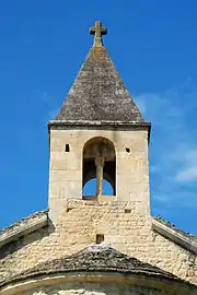 La toiture de lauzes est surmontée d'un élégant clocher carré percé de quatre baies campanaires à colonnettes et de trous de boulin (trous laissés par les échafaudages).