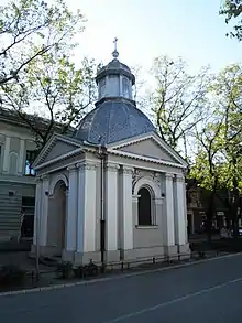 Aujourd'hui, la chapelle se présente comme un petit édifice à nef unique prolongée par une abside demi-circulaire ; elle est dominée par un dôme massif[1] surmonté d'une lanterne, d'un petit dôme et d'une croix[2]. L'entrée voûtée est encadrée de pilastres dotés de chapiteaux moulurés. La décoration des façades, toutes traitées comme un temple grec avec des frontons triangulaires soutenus par des chapiteaux ioniques[2], est caractéristique du style néo-Renaissance propre au travail de Mačković[1].
