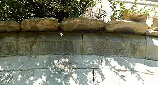 La corniche de l'abside est ornée de motifs sculptés, végétaux ou géométriques, dont l'un, énigmatique, semble figurer une pioche et trois portes cintrées.