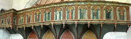 - la face visible du chœur présente les sept vertus catholiques (ou théologales), et cinq saints dont saint Yves.