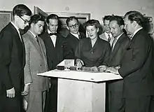 Photographie de l'architecte Kaija Siren présentant un modèle de la Chapelle d'Otaniemi, en 1954.