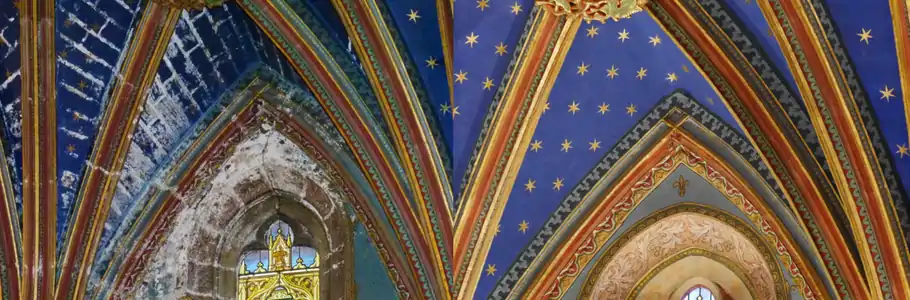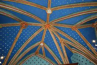 Au point de jonction des nervures dans chaque travée on voit des écussons et des fleurons d'une grande richesse, ainsi que des représentations d'anges et d'humains.