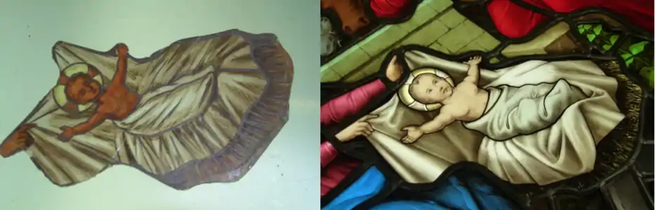Des éléments cassés parmi les vitraux,