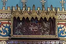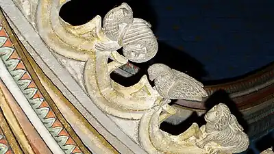 - Arc triomphal : La retombée de chaque lobe est ornée de festons chargés d'animaux fantastiques ; ceux de droite symbolisant les vertus, ceux de gauche symbolisant les vices. Au sommet de l'arc, un ange tient un étendard.