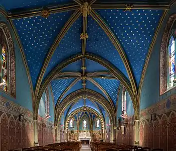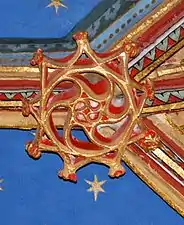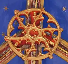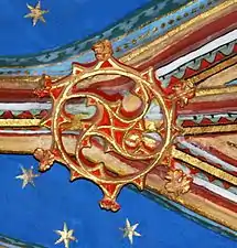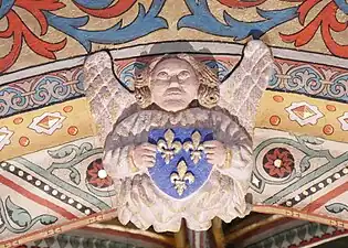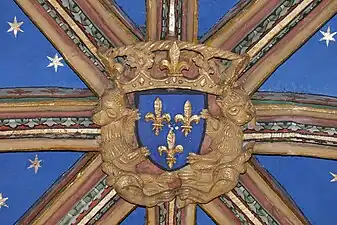 - Chœur : La clef de voûte est un écu aux armes de France, avec fleurs de lis dorées sur fond d'azur. Un fleuron en forme d'écusson à droite montre un bâton en barre accompagné d'un croissant en chef et d'une étoile en pointe. Chacun des quatre autres fleurons a un thème végétal.