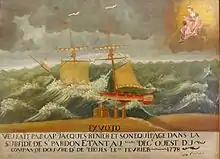 - Troisième ex-voto : Peinture sur toile, Vierge dans les nuages, tempête, navire en détresse et cette inscription : « Ex-voto. Vœu fait par capitaine Jacques Renier et son équipage dans le surfide de Saint-Pardon le 28 février 1778 ».
