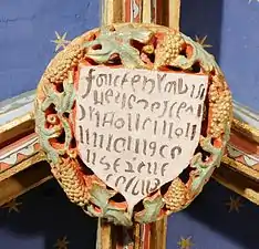 - Travée IV : La clef de voûte représente l'Agnus Dei. Deux des cinq fleurons contiennent un charabia de pseudo-inscriptions en écriture cursive. Les signes ne sont pas d'un alphabet quelconque.