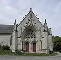 La chapelle s'accroupit en forme de croix latine. L'aile méridionale du transept présente une façade particulièrement remarquable. Elle est occupée presque entièrement, entre les contreforts d'angle et sous les rampants du toit, par un portail solennel. La grande baie brisée, aux voussures multiples, contient deux portes jumelles en anse de panier à accolade et un tympan à mouchettes sans redents. Une nouvelle accolade l'enveloppe à l'intérieur d'un faux gable qui atteint le sommet du pignon. Si l'on y voit toujours les crosses végétales, ce sont des animaux qui remplacent les fleurons et se juchent sur les pinacles latéraux. Nous avons là, une des plus belles façades morbihannaises.