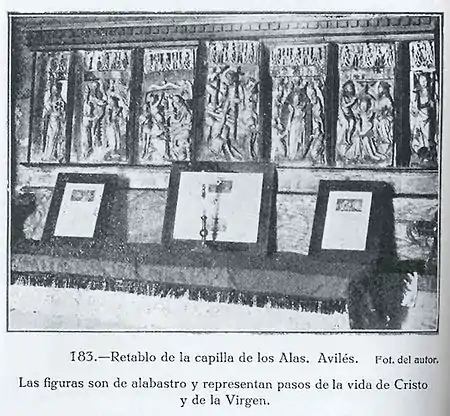 « La Capilla de los Alas fue profanada durante el dominio rojo, rompiendo las arcas de los sepulcros con otros detalles y labores de su interior, no habiendo sido incendiada por no tener materiales combustibles y estar cubierta con bóveda de crucería construida en piedra. El retablo, de alabastro, dicen que fue machacado, aunque no se ha podido comprobar tal supuesto, ya que no apareció en el interior de la Capilla resto alguno que viniera a justificar la explicación conocida. (Luis Menéndez Pidal, Los monumentos de Asturias, p. 98). »