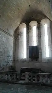 Au nord, dans l’épaisseur des murs, on a logé un escalier conduisant à la chaire. Pas de fenêtres latérales, à cause des constructions qui étaient élevées sur l’un et l’autre flanc, ainsi qu’en témoignent le solin et les files de corbeaux qui sont destinés à recevoir les faîtes des appentis. Solin et corbeaux se prolongent sur la face ouest, afin de faciliter l’établissement d’un porche. Extérieurement, le chevet est plat, terminé en pignon et ornée de trois fenêtres, plein-cintre à l’intérieur et ogivale à l’extérieur. La construction est très soignée, d’un moyen appareil superbe ; les assises, bien réglées, ont 31 cm de hauteur. Un banc court à l’intérieur, le long des murs, jusqu’au sanctuaire.
