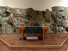 Les murs intérieurs de la chapelle sont blancs et maçonnés de manière que les jointures forment des lignes verticales et horizontales uniformes. Une grande partie de la partie inférieure du mur de l'autel est constituée de roche nue.
