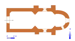 La nef a conservé, dans sa partie orientale, une partie de ses voûtes typiques du gothique de l'Ouest ; les voûtes de la travée occidentale, très certainement identiques, ont disparu[2]. Cette même travée est à l'origine éclairée par deux hautes baies, une par face, dont la hauteur est réduite avant le XIVe siècle puis qui sont complètement murées, peut-être après l'accident de 1756[4]. À l'intérieur de l'édifice, un arc brisé sépare la nef du chœur[FA 6].