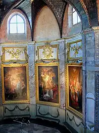 Ces tableaux sont placés dans des cadres en gypserie dorés à la feuille.